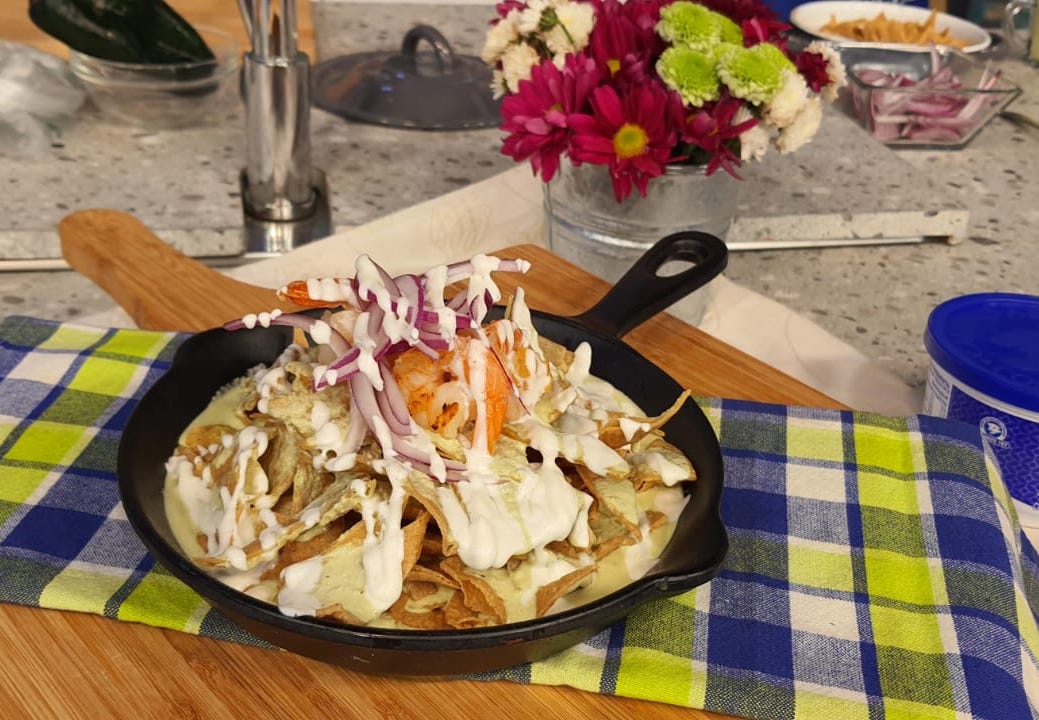 4. Para el montaje, servir totopos y bañar con salsa de chile poblano encima colocar camarones y decorar con crema y cebolla.