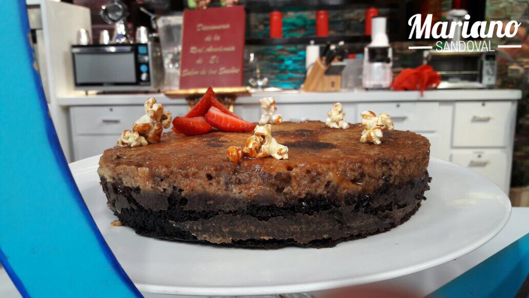 6. Para el montaje, desmoldar el pastel y, si lo desea, decorar con fresas en cuartos.
